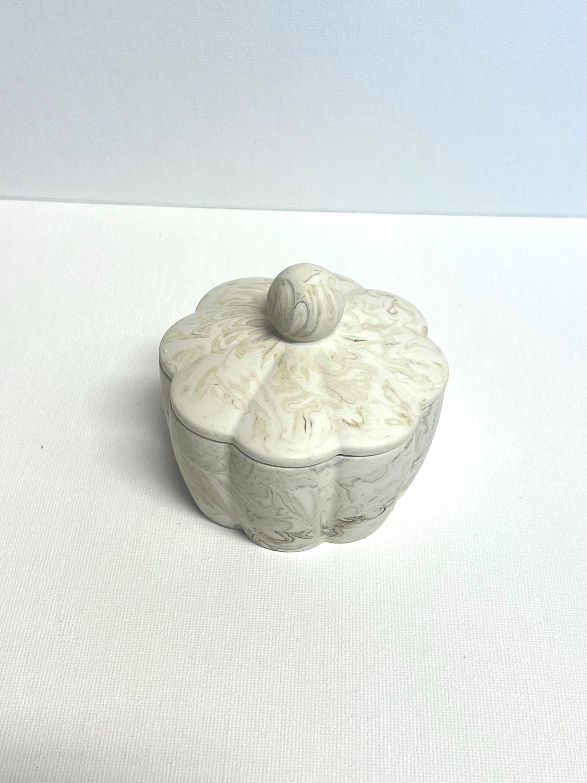 A small and charming jar, shaped like a flower with a rounded lid. The playful shape adds an organic and delicate touch.