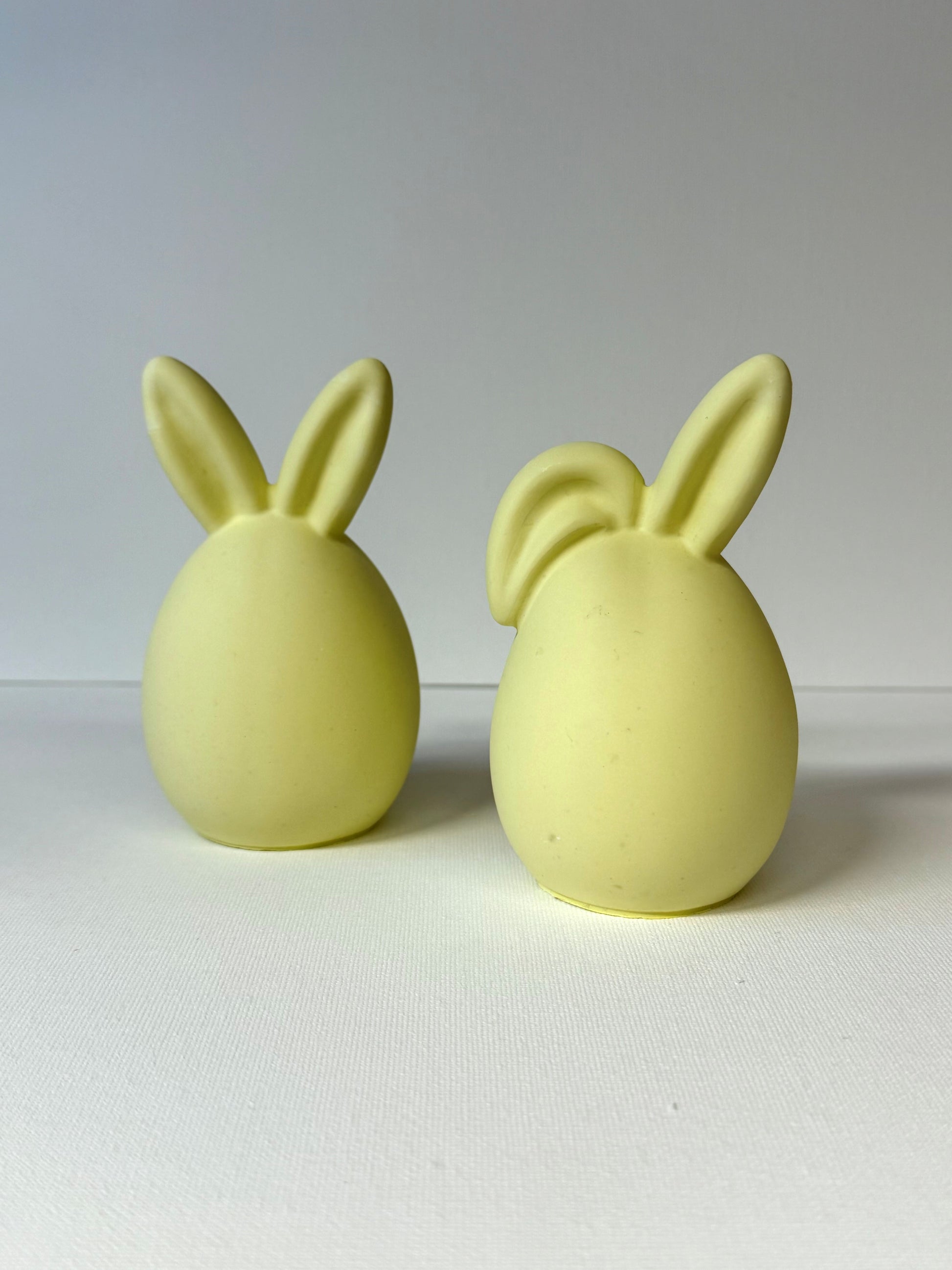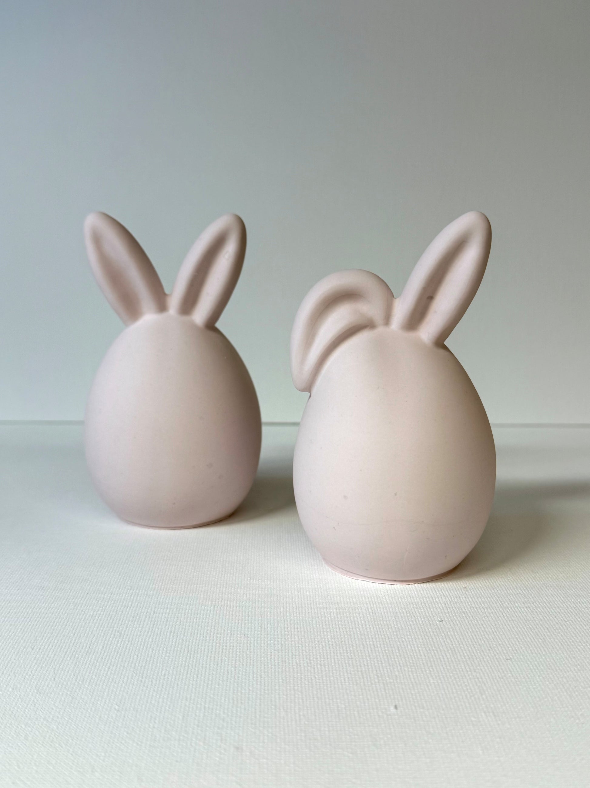 Denne sjarmerende påskefiguren kombinerer formen av et klassisk påskeegg med myke, stiliserte kaninører.